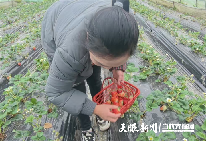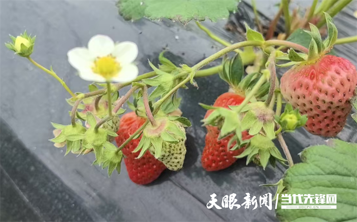 红旗社区居民胡世敏正在打理草莓。她告诉记者:“这里的草莓有巧克力味和奶油味两种,每斤售价40元。草莓个头大,五六个就有一斤重。每年8月栽种,12月就能采摘,一直持续到次年5月。”