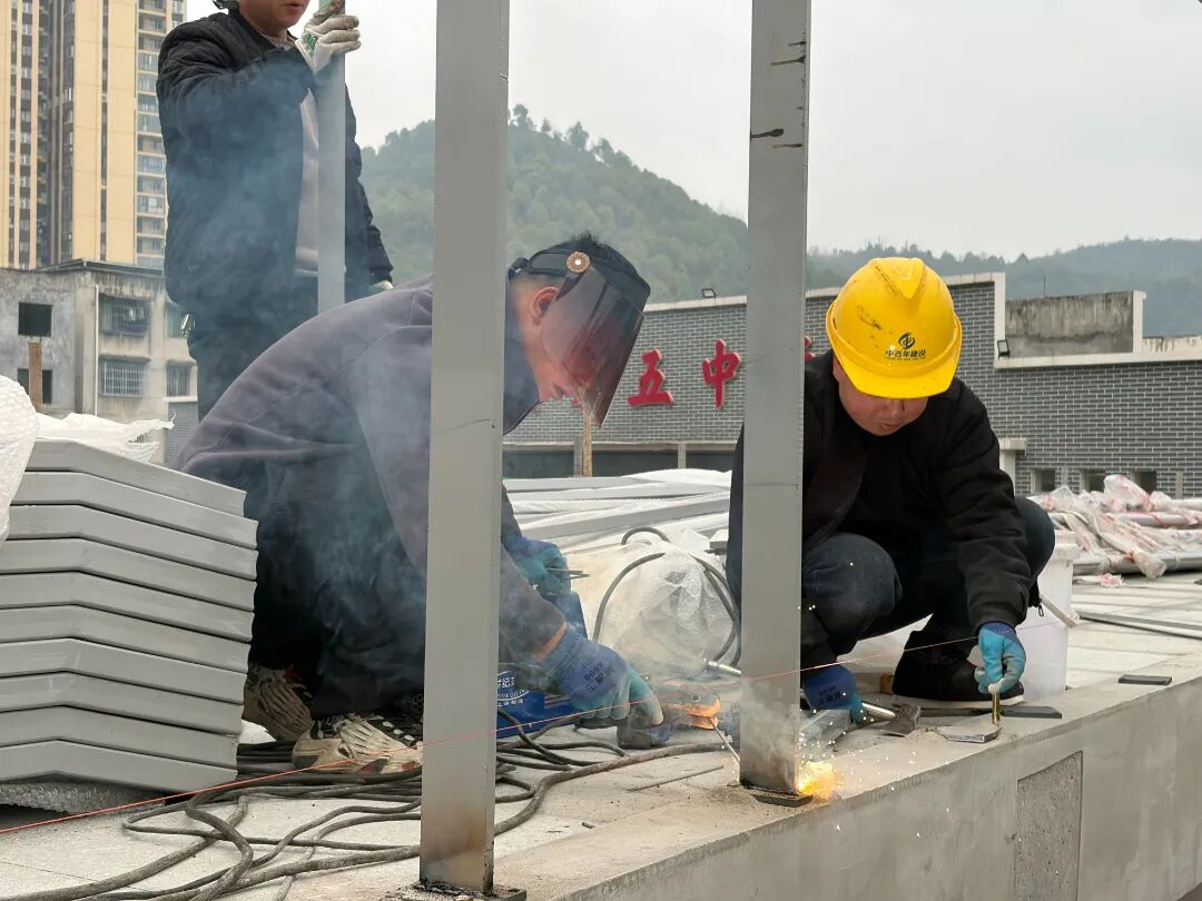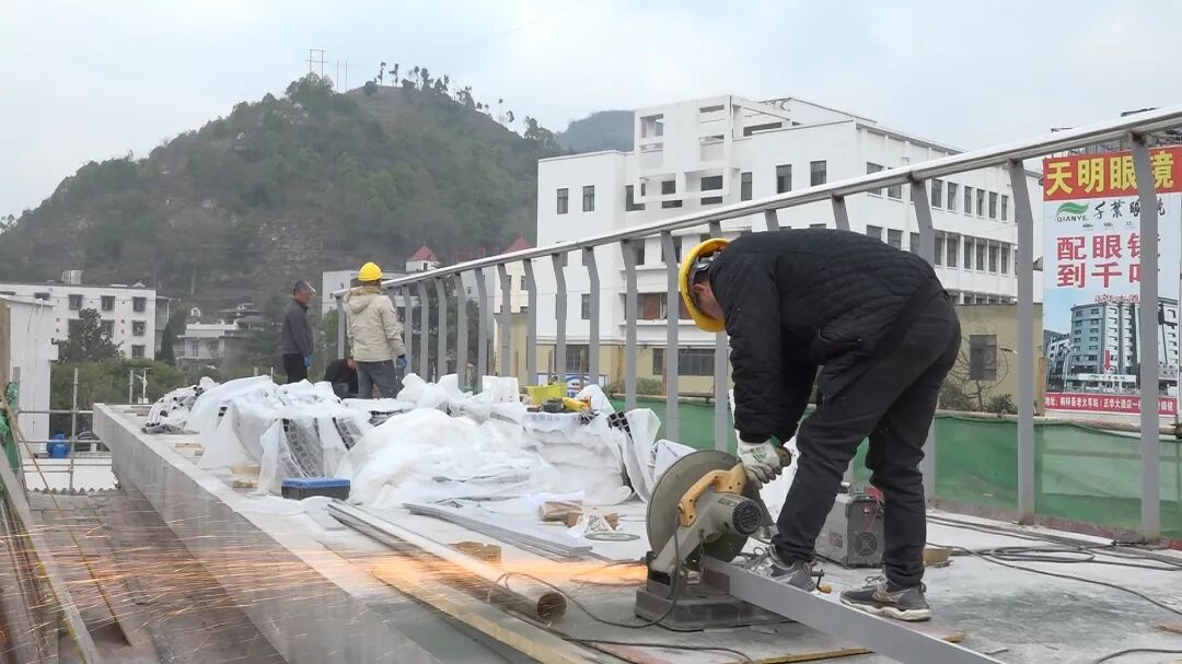 近日,记者来到桐梓县第五中学人行天桥施工现场,焊花闪烁、机器轰鸣,工人们正有序进行栏杆焊接、楼梯清理等收尾作业。