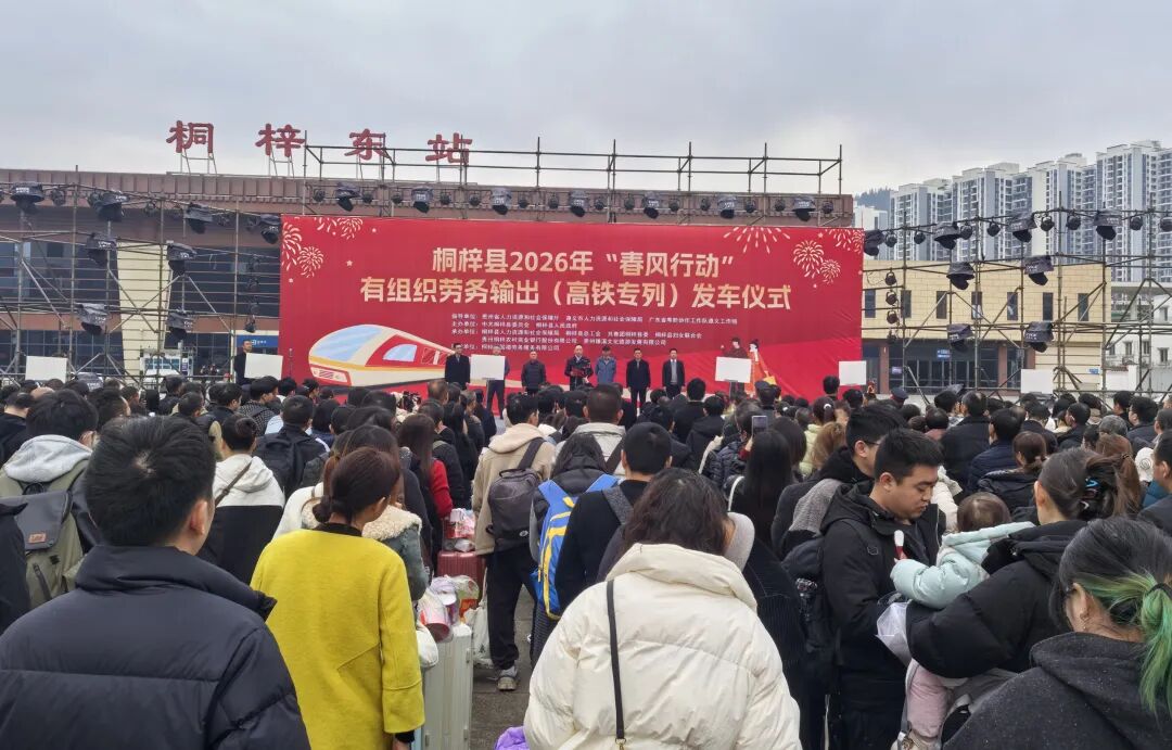 2月22日,桐梓县2026年“春风行动”有组织劳务输出(高铁专列)发车仪式在桐梓东站广场举行,我县570名务工人员乘坐开往广州南的G4553次高铁,开启新的务工旅程。